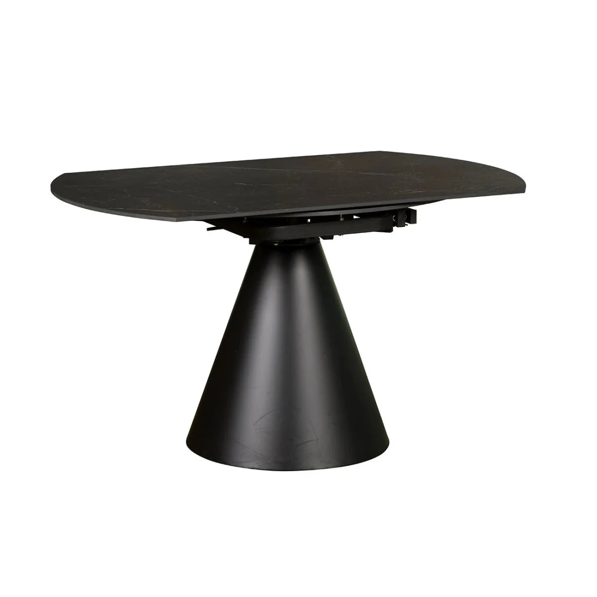 The tabletop is crafted from high-performance sintered stone, offering a sleek ceramic surface that is resistant to heat, scratches, and everyday wear. The rich black finish with natural veining adds a luxurious touch while remaining practical for busy households.
