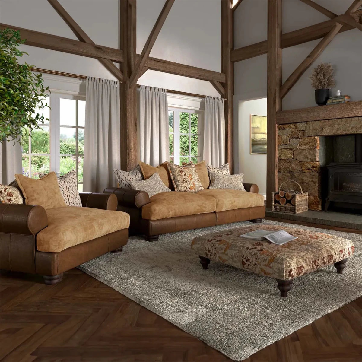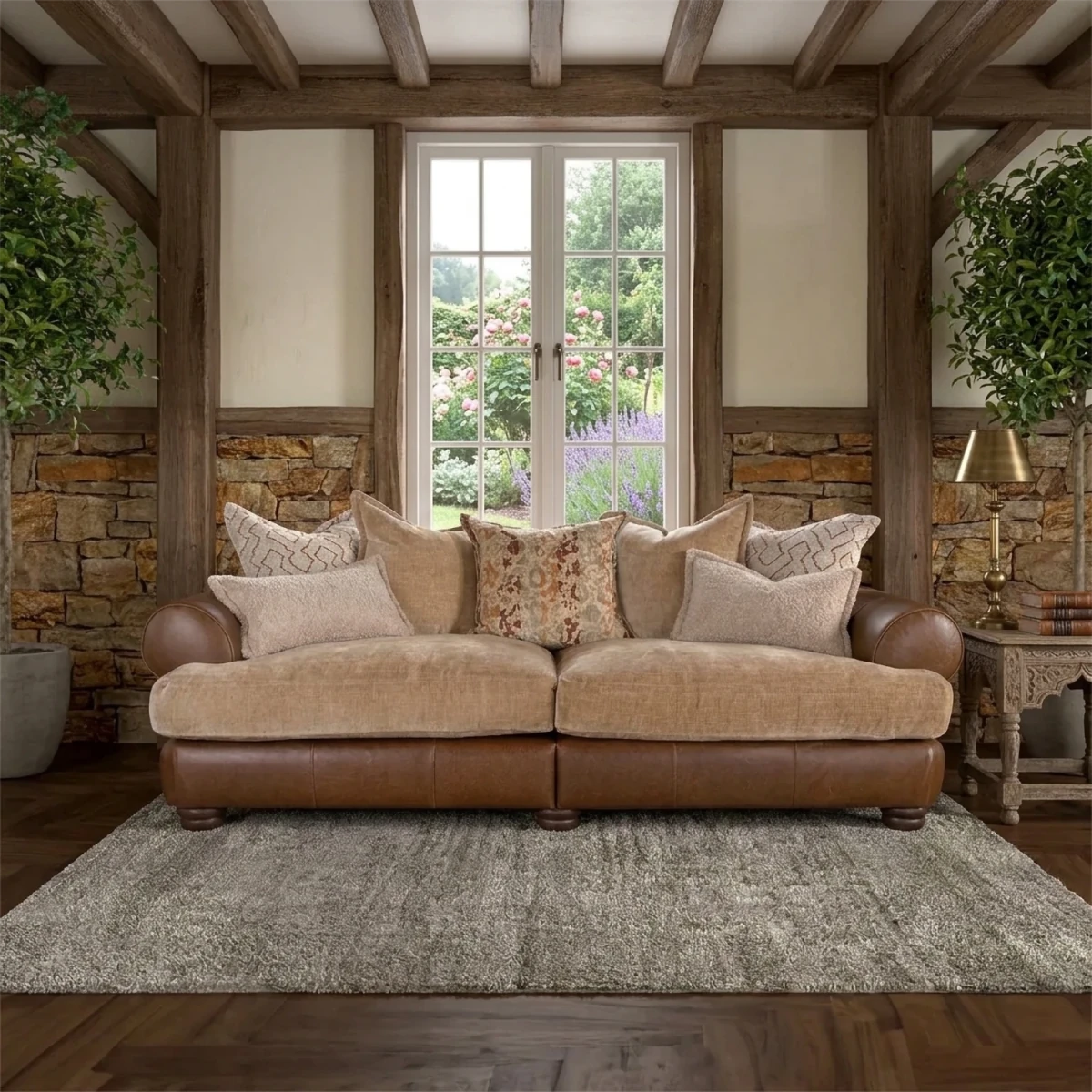 The Horatio Mix Sofa Collection combines classic country-inspired styling with luxurious comfort and expert craftsmanship. Designed to create a warm and inviting living space, this elegant range features a distinctive combination of soft fabric upholstery and rich faux leather accents, giving the sofa a timeless and sophisticated look.