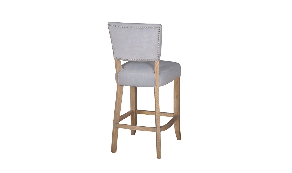 Bring a touch of sophistication to your home with the Light Grey Velvet Bar Chair with Solid Oak Legs. Designed for both comfort and style, this bar chair features a plush velvet seat and back, elegantly paired with a solid oak wood frame, legs, and armrests. The studded detail on the backrest adds an extra layer of refinement, making this piece a standout addition to any space.