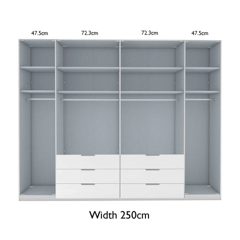 With six hinged doors, this wardrobe provides easy access to a well-organised storage system. The middle four doors can be customised with or without mirrors, allowing you to tailor the wardrobe to your preferences. Below the middle four doors, you’ll find six spacious drawers arranged in three under each set of two doors, providing additional storage for accessories, clothing, and essentials.